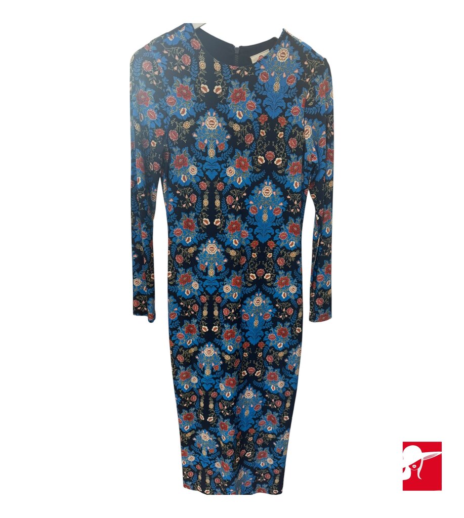 Embrace the art of elegance with the Blue Arabesque Floral Jersey Midi Dress, featuring a captivating blend of deep blue hues and vivacious floral patterns that dance across the fabric. Crafted with a comfortable round neckline, this figure-skimming piece celebrates the feminine silhouette through its long, slender sleeves and graceful midi length. Made of carefully chosen responsible materials, it beautifully reflects your commitment to style with a conscience. Excellent pre-owned condition.
