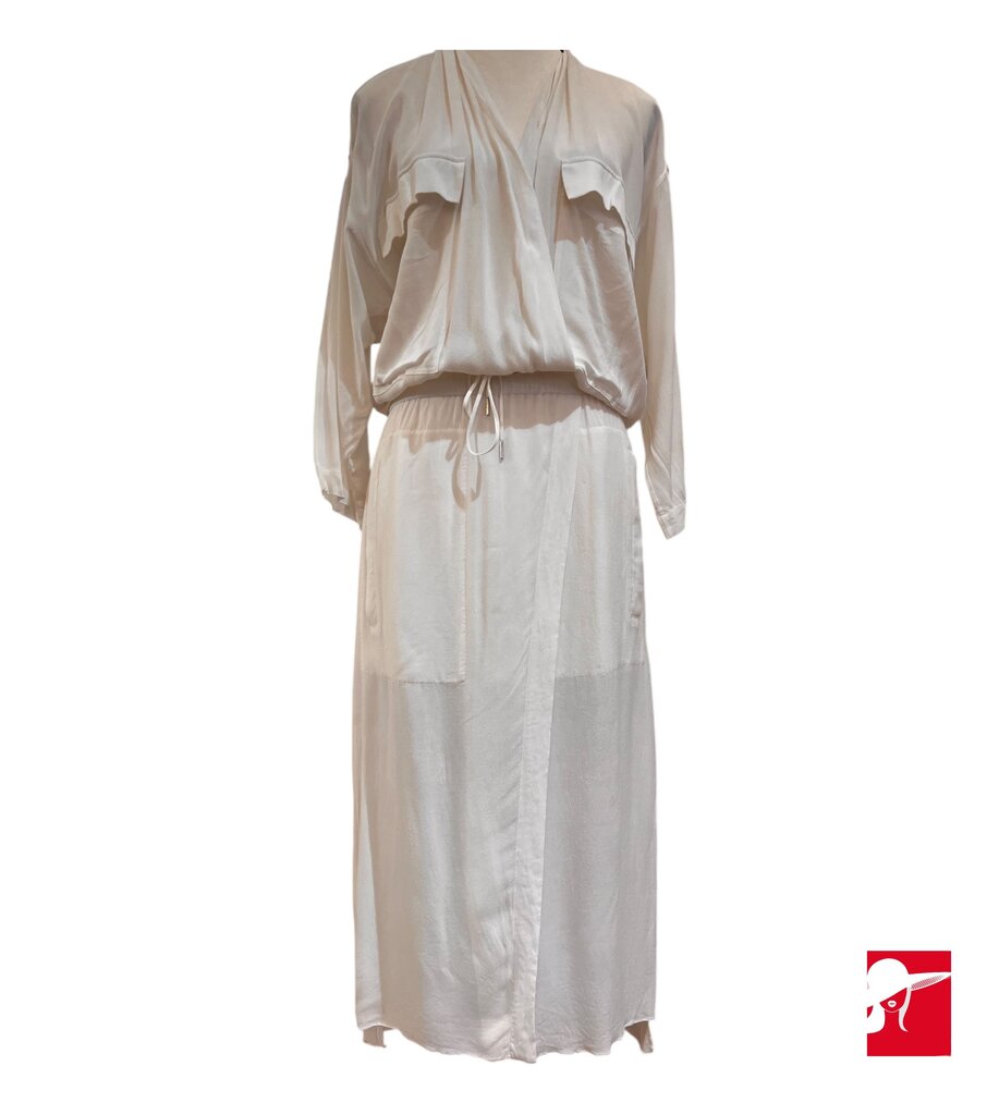 Helmut Lang elastic waist midi dress. This dress is casual chic at its finest. Lightweight, sheer top and lined skirt. Side slits, elastic drawstring waist. 3/4 sleeves, front pockets.