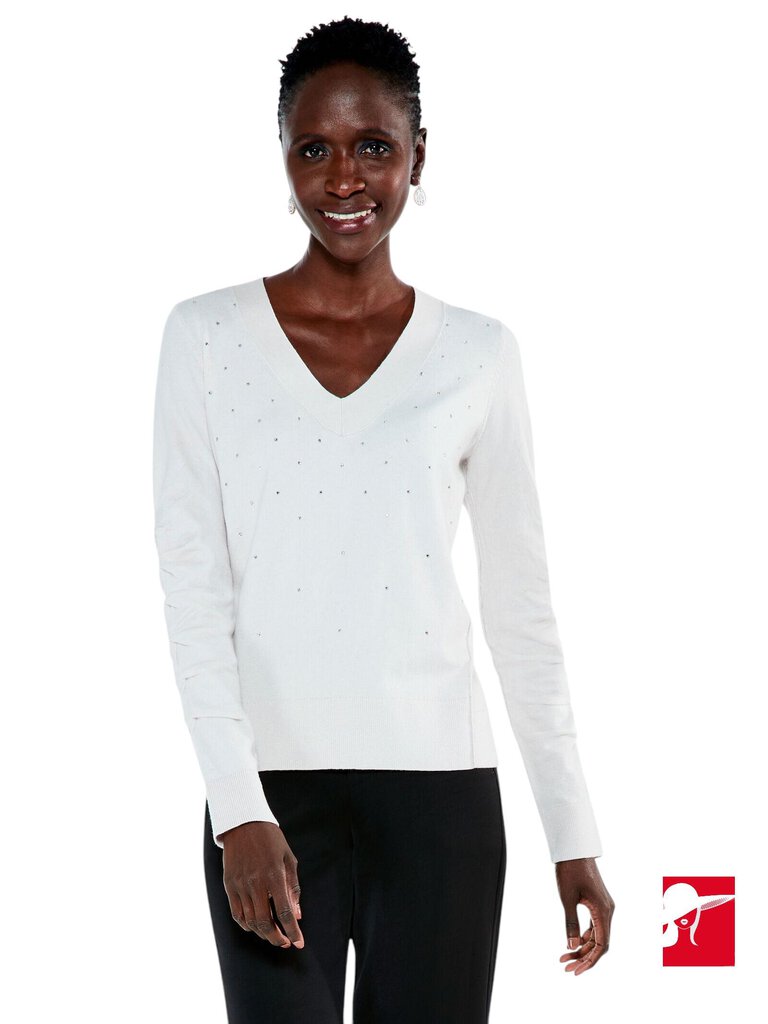 Nic + Zoe v neck rhinestone sweater NWT. Twinkle, twinkle, little sweater...An easy, relaxed fit that's set to shine thanks to the rhinestone embellishments sprinkled throughout. The ruched sleeves add even more detail and elevate the look. The shape is a classic pullover V-neck with an extra-large band around the color for style and comfort. Mindfully Made from no waste knitwear! 58% cotton 29% polyester 19% nylon