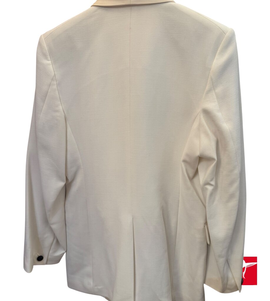 Gorgeous tuxedo style long blazer, crafted from crepe and a wool-blend and features satin trims, buttoned cuffs, a breast pocket, and two front flap pockets. The blazer has a button fastening at the front, is fully lined, and has a back vent. The notched lapel blazer is a mid-weight, non-stretchy fabric. Dry clean. Pre-owned NEW, with tags. Retail price $695.