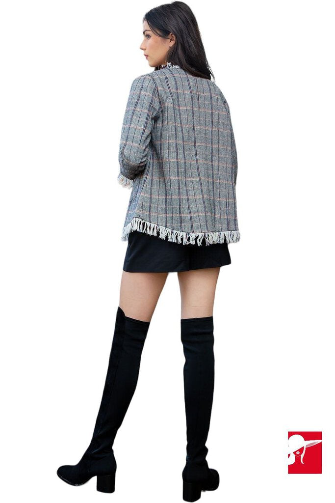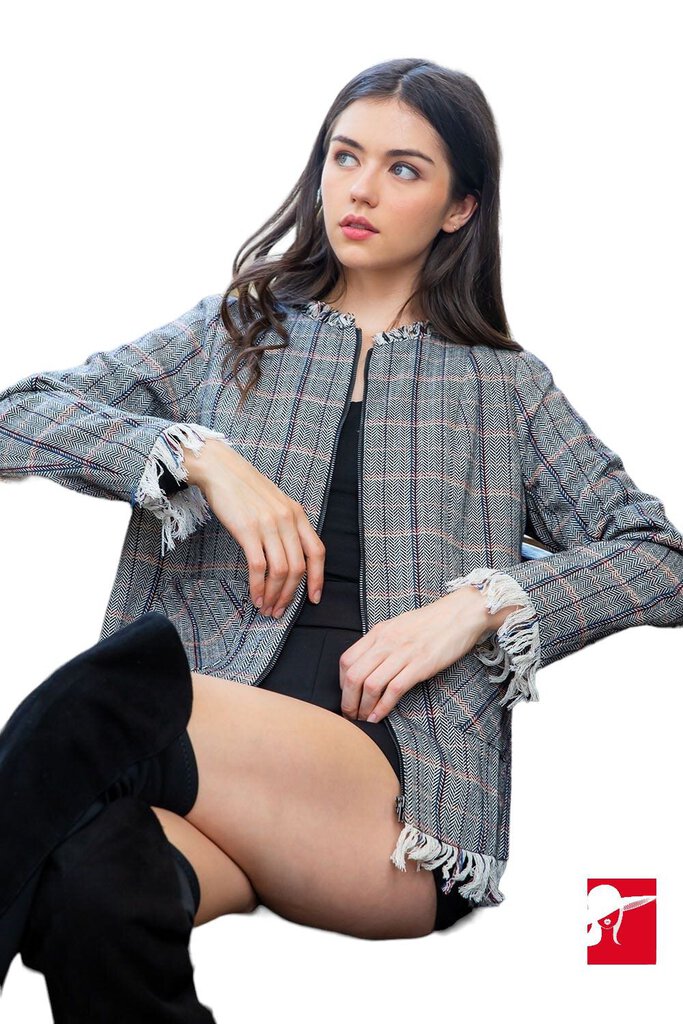 THML plaid fringe jacket NEW. Your new go-with-everything jacket! A gorgeous plaid with fringe hem and cuffs. Zip front, collarless. Fully lined. Cotton/Polyester.