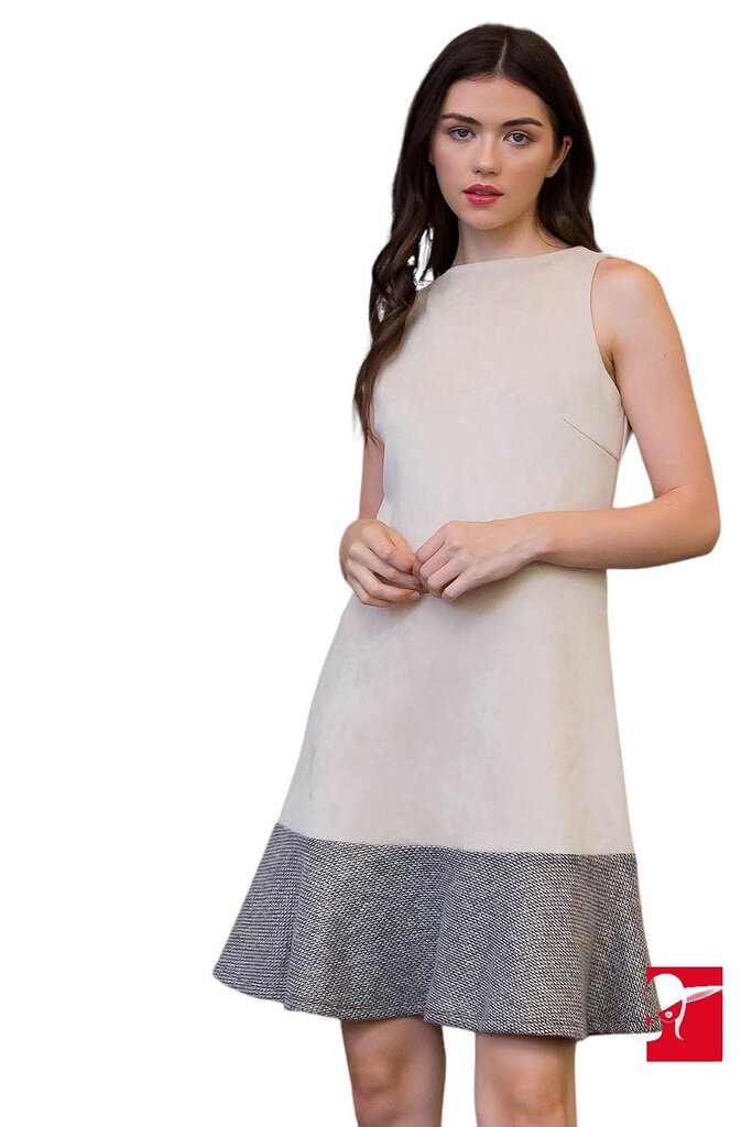 THML sleeveless flared hem dress. A lovely dress for three seasons. Ultrasuede bodice with tweed peplum hem. Back zip. Polyester/Spandex