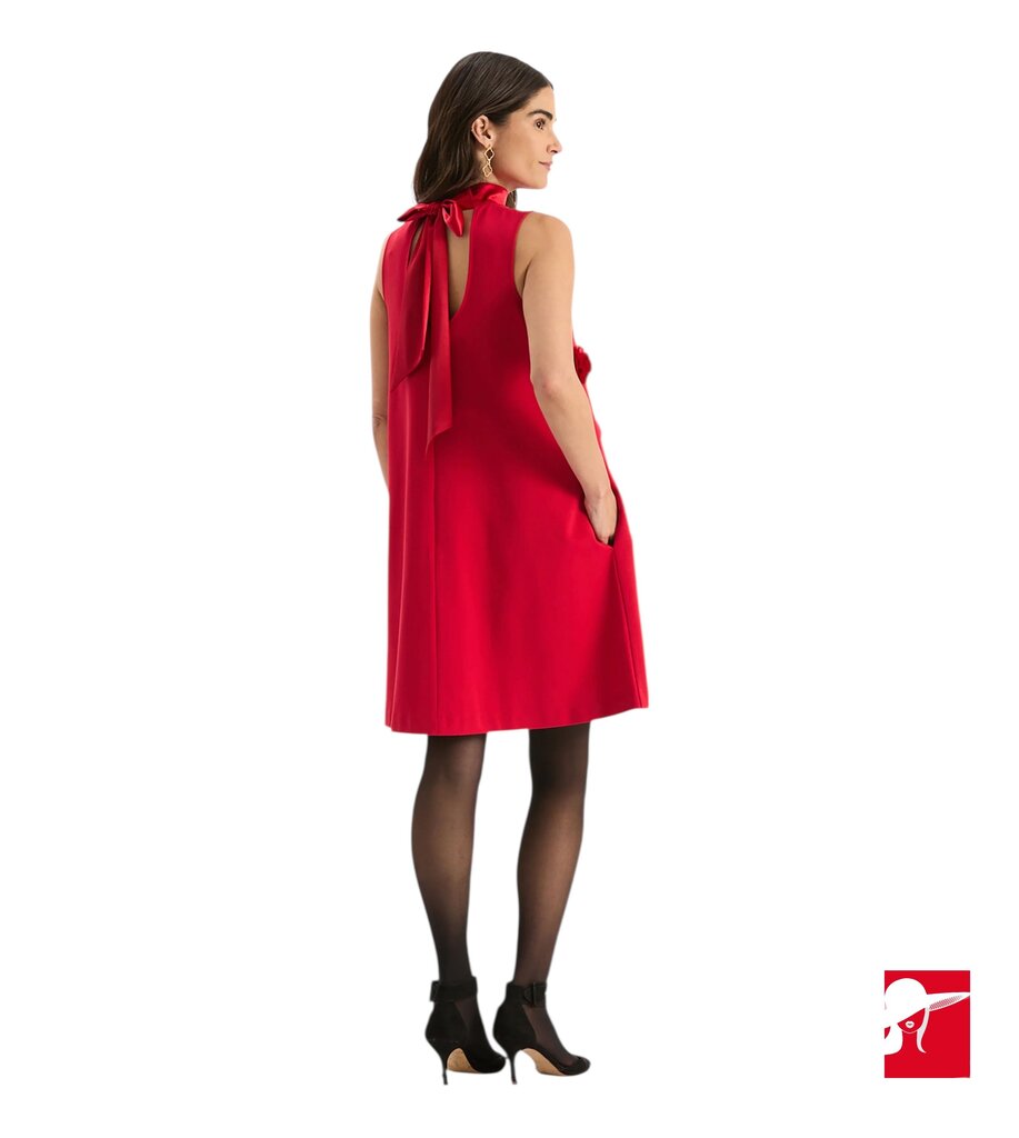 Cleo Ponte Satin trim dress NEW. A festive pop of red for the holiday season in the new Cleo Ponte Satin Trim Dress — a vibrant, modern take on classic glamour. Crafted from a structured ponte fabric for a comfortable feel, this A-line dress features a mock neckline, a bow tie at the back, and floral appliqués for feminine flair and sophistication. Easy to dress up and effortless to style, this piece elevates any look from cocktail parties to dinner events. Sleeveless A-line silhouette Satin mock neck with bow-tie back Rosette floral embellishments Side pockets Back keyhole with tie closure Fully lined Shell: 63% Rayon, 32% Nylon, 5% Spandex, Trim: 97% Polyester, 3% Spandex Dry clean