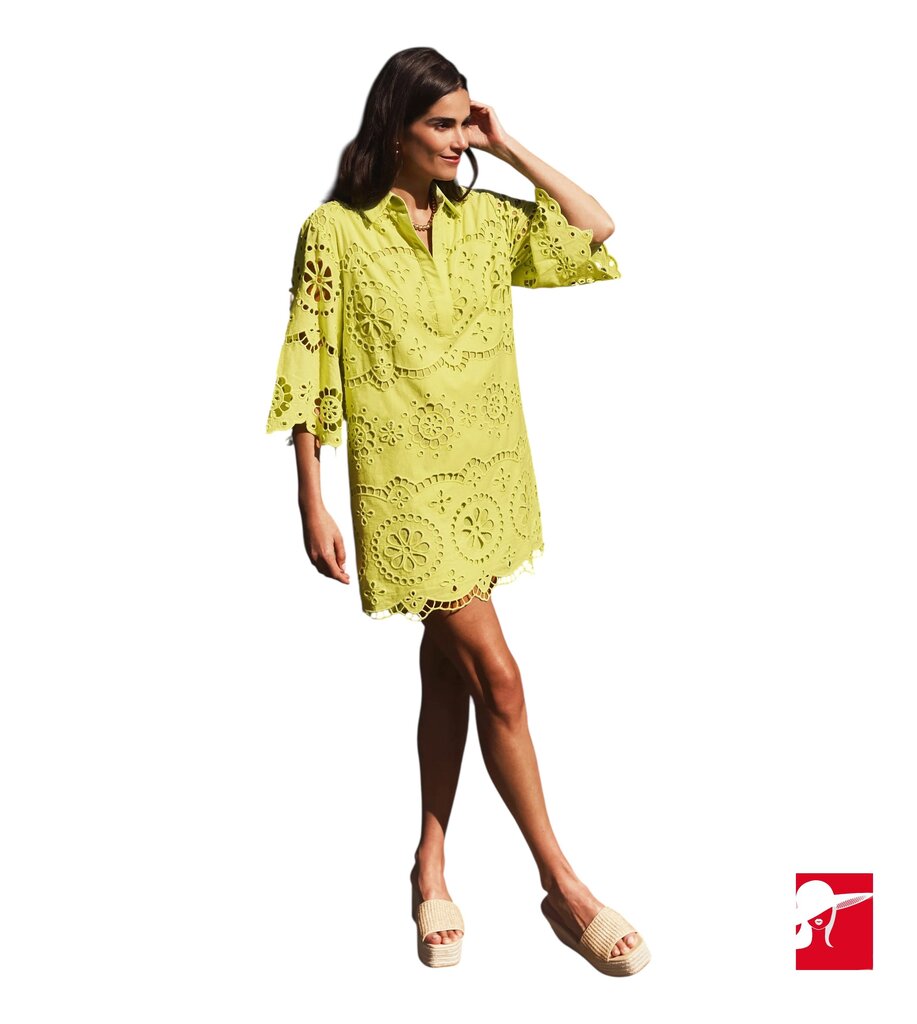 Penny with allover eyelet detail is a classic point collar with front placket and an easy, versatile silhouette. This effortlessly chic style can be worn as a tunic to the beach or as a dress to lunch or dinner – the styling possibilities are endless! Point collar with front placket Three-quarter sleeves Allover eyelet 100% Cotton Machine wash cold, line dry