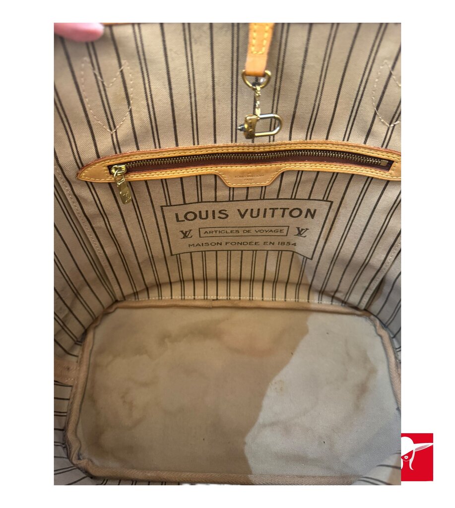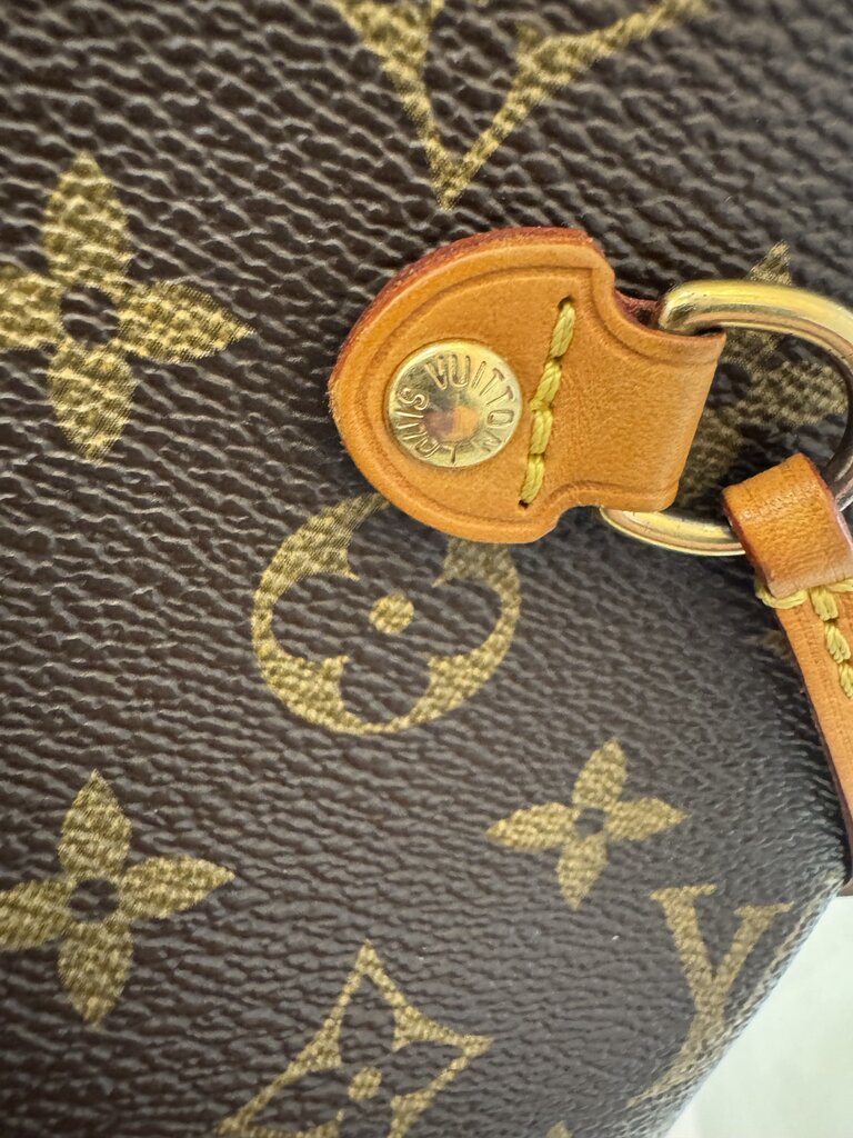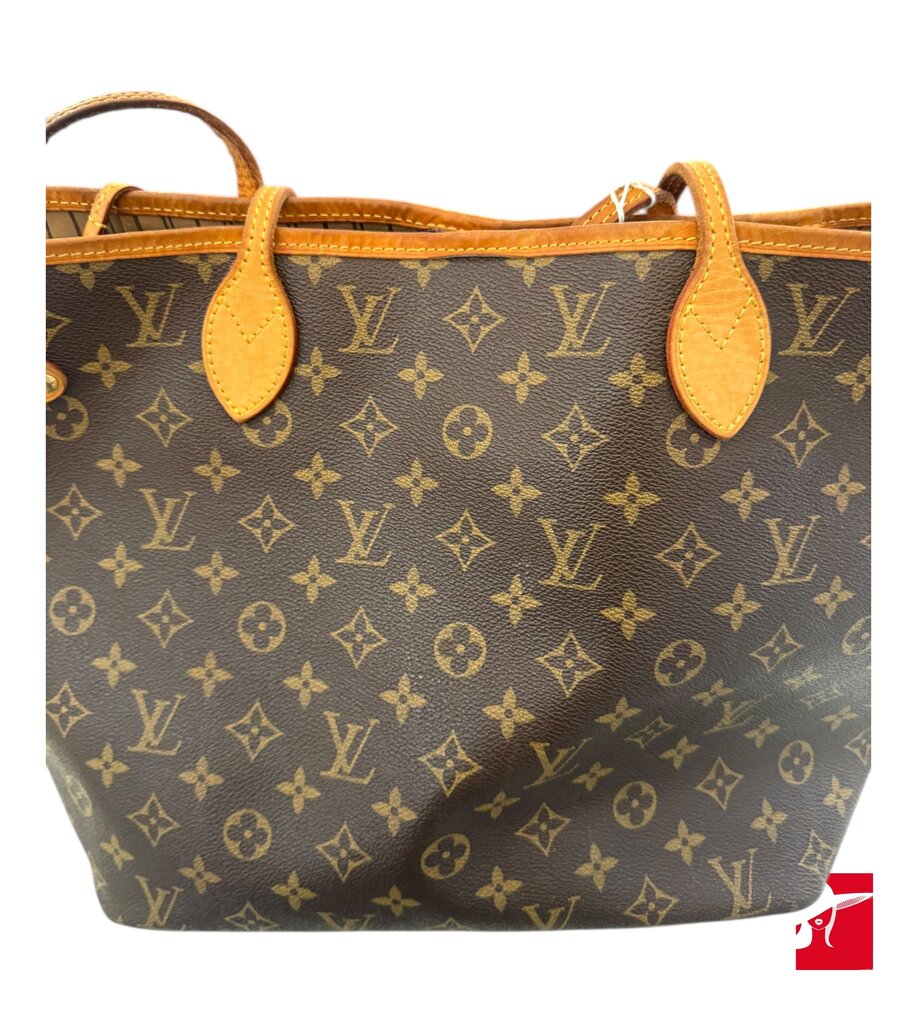 The Neverfull MM tote unites timeless design with heritage details. Made from supple Monogram canvas with natural cowhide trim, it is roomy yet not bulky, with side laces that cinch for a sleek allure or loosen for a casual look. Slim, comfortable handles slip easily over the shoulder or arm. Lined in colorful textile, it features a removable pouch which can be used as a clutch or wallet. Fits: 13-inch laptop, smartphone, keys, Zippy Long Wallet. Excellent pre-owned condition, has a small bit of wear on one corner, and some small stains at the bottom inside (see photos).