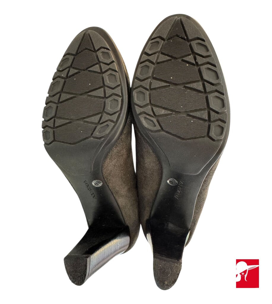 Aquatalia mid-calf fur trim suede boots. The perfect chic cold weather boot! Round toe, 3.25 in. heel. Off white stitching on back. Shaft 9". Slip on style. Aquatalia usually runs a half size small. Excellent pre-owned condition.