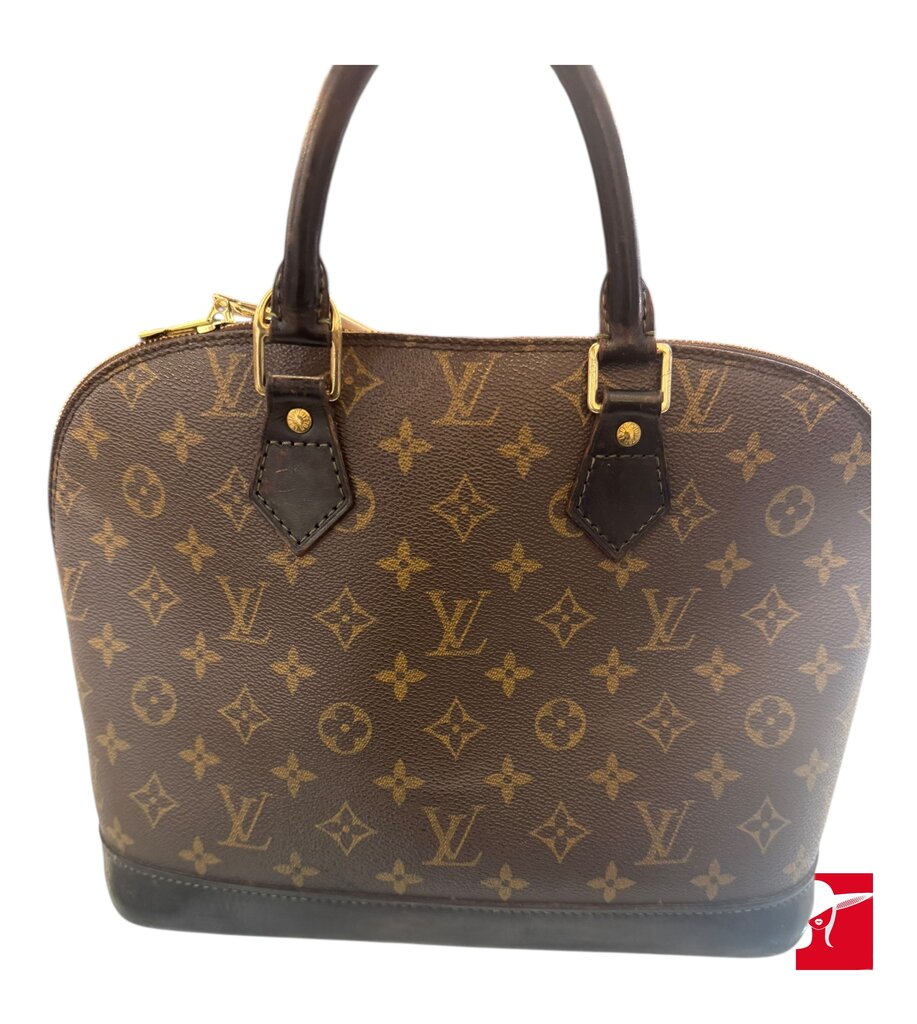 Louis Vuitton Alma dark brown bag. The classic Alma, in LV's signature monogram style. Dark brown handles and base. 3 in. handle drop -- a crossbody strap can be easily added. One pocket interior. Comes with LV lock. Certificate of Authenticity. Very good pre-owned condition.