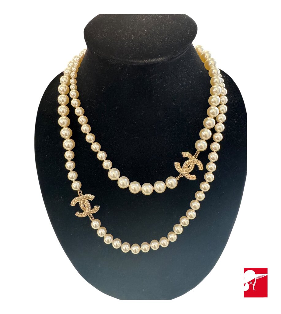 Chanel pearl baguette crystal CC necklace. This stunning piece is along strand of fine faux pearls with two gold set Chanel CC medallions encusted with crystals on one side of each.